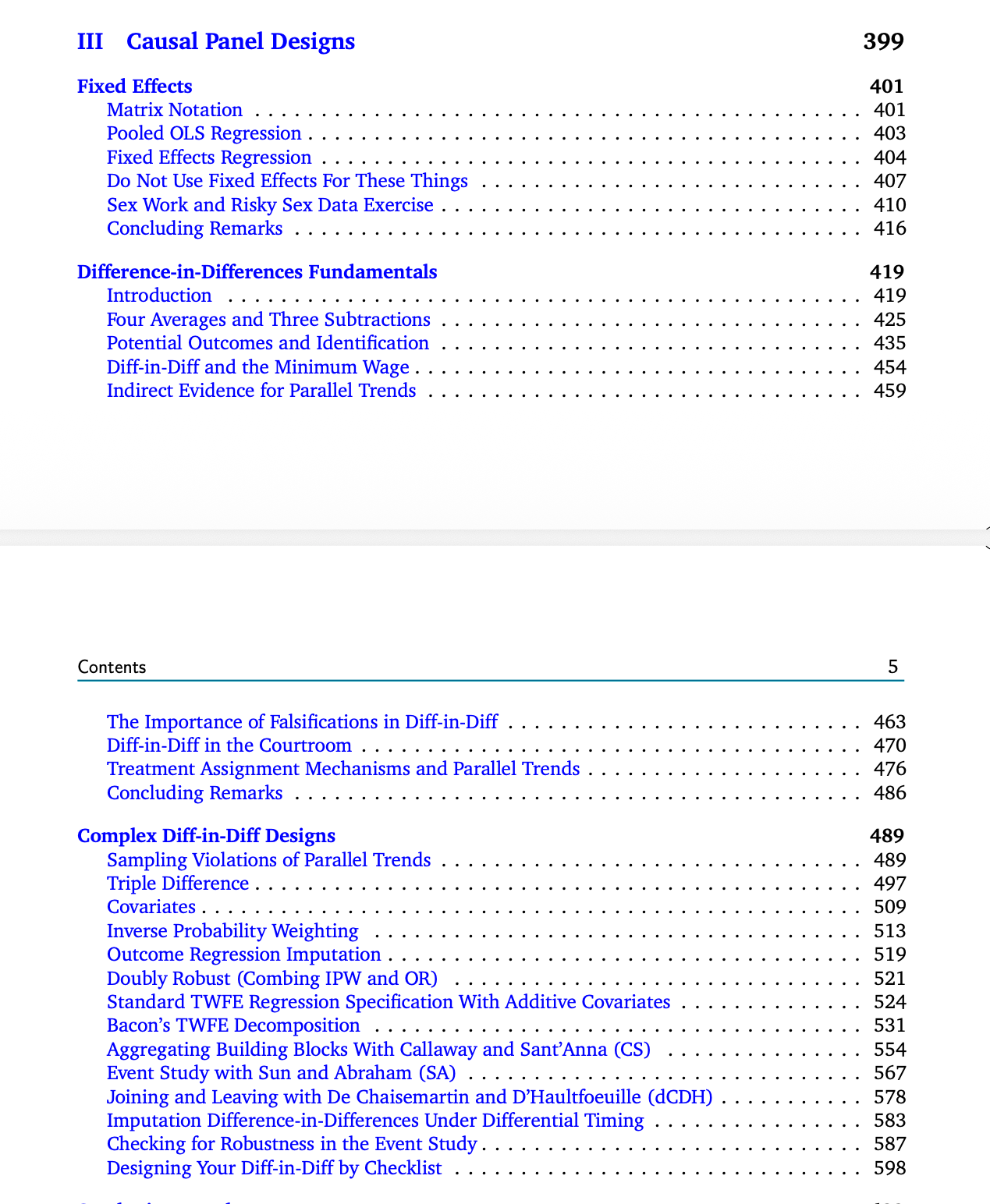 Beginning Saturday November 15, I will likely be educating a 4 day, unfold over two consecutive weekends, workshop on difference-in-differences. That is going to be over zoom, beginning at 9am CST (Chicago time) / 10am EST (Boston time), and it’ll cowl kind of the 2 new chapters of my new e book, Causal Inference: the Remix with Yale, set to come back out subsequent summer time (or this summer time relying on whether or not you speak in regards to the upcoming dates utilizing the “subsequent” or “this”) 2026. Let me present you the desk of contents from the e book.