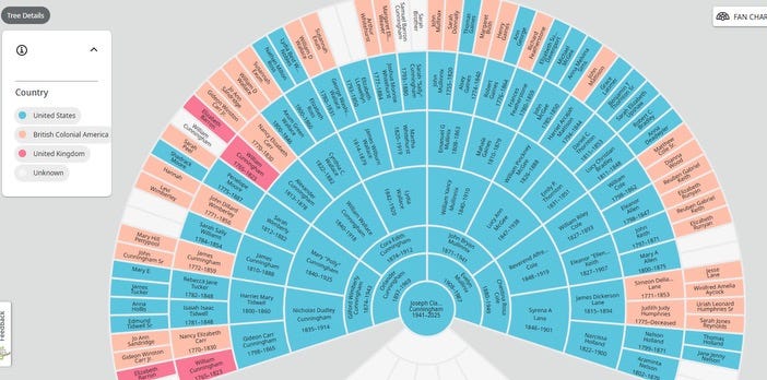 You may see within the household tree on the left that my household goes again to the Cunningham clan in Scotland. I discovered previous couple of years from visiting Scotland in the summertime (and once more will likely be there in the summertime of 2026 in Glasgow to do a weeklong workshop) is that the Cunningham clan supported Robert the Bruce. I solely know who Robert the Bruce is from Braveheart, however put that apart — I take into account us on the proper facet as a result of that meant we have been on William Wallace’s facet. Properly if you happen to transfer as much as the north-west of pop’s household tree you will discover a number of folks named William Wallace weirdly sufficient.