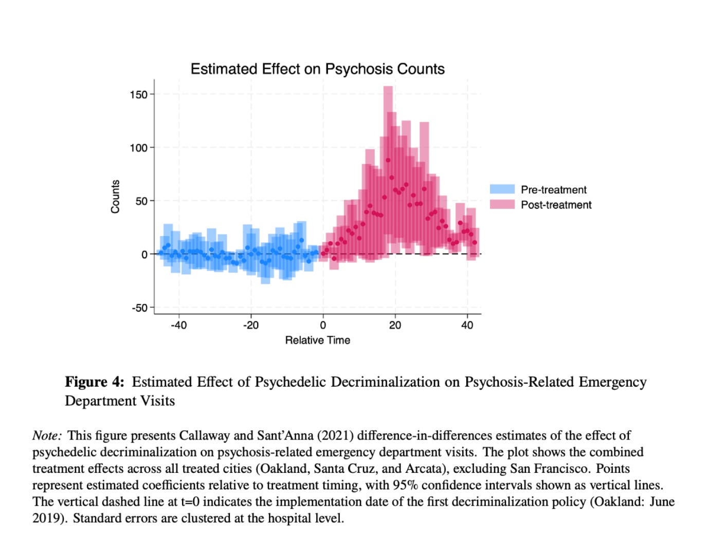 As soon as I get the draft rewritten, I’ll put up it on-line and begin sharing the outcomes. It’s not fairly prepared for prime time, as I’m doing a serious rewrite, however I feel we’re kind of the primary to estimate the causal impact of any psychedelic reforms, not to mention on ED visits for psychosis. I feel it’s an important paper for these within the subject, and I feel can make clear the challenges of shifting ahead with a purely medical mannequin the place psychedelic therapies are distributed via the medical networks versus the sort of municipality decriminalization that we’ve got been seen quietly unfold since 2019. However right here is the headline end result.