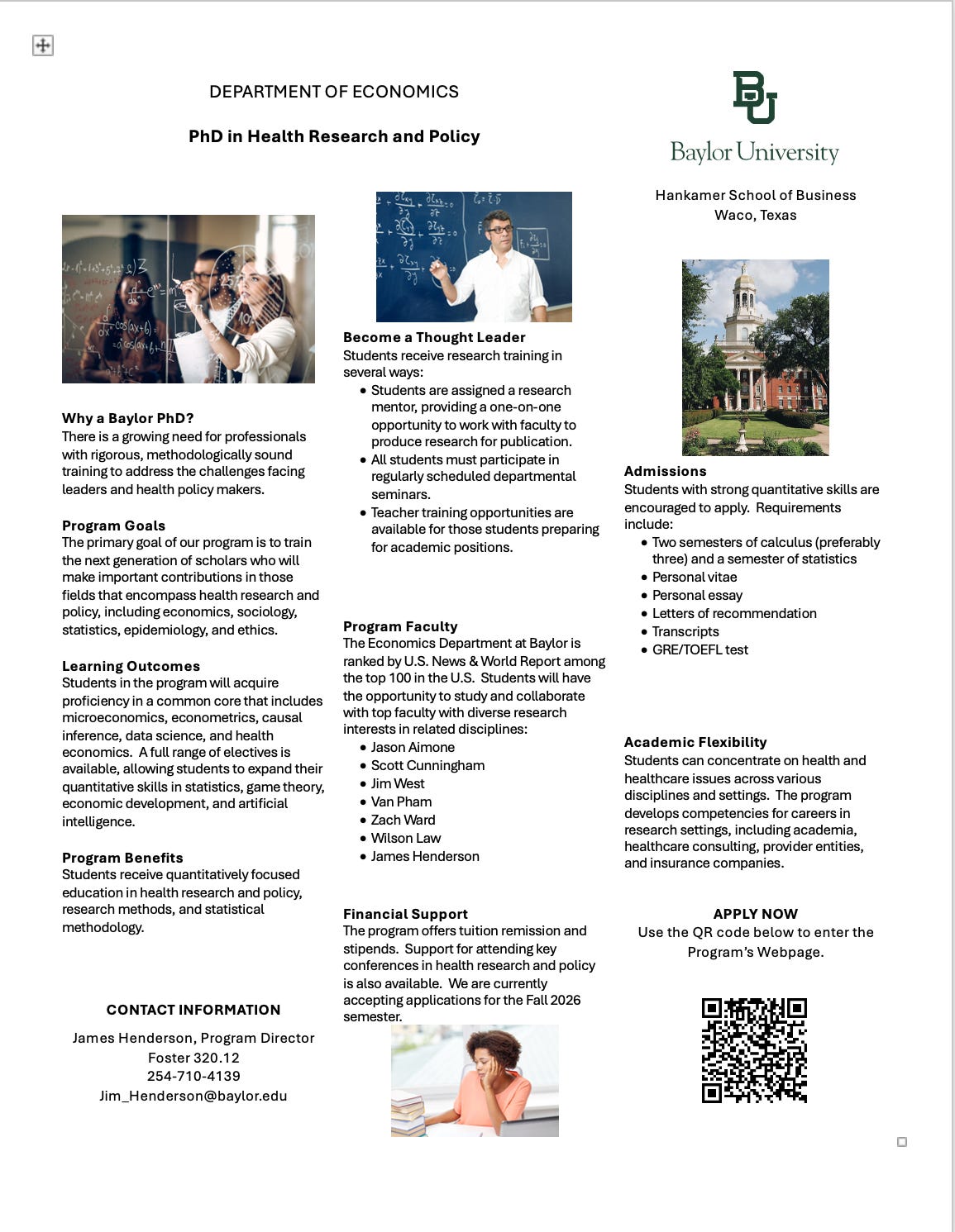 As I mentioned, I would be the PhD coordinator for Baylor’s PhD program in well being companies analysis. The web site is being up to date, and I’ll share extra about it within the months to come back, however in case you are inquisitive about well being companies analysis, come test it out and take into account making use of! Baylor has nice college, current firm excluded. It’s a small program, and also you subsequently get quite a lot of consideration from college who I take into account to be very good, onerous working, productive, impactful students of their respective fields. So come test us out.